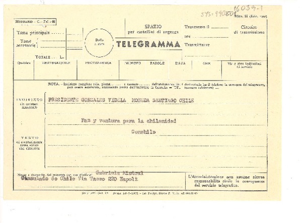 Mistral, Gabriela - González Videla, Gabriel - Manuscritos chilenos - Correspondencia