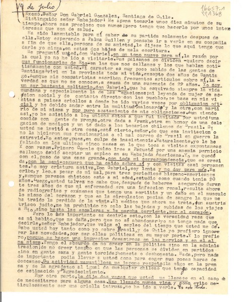 [Carta] [194?] jul. 19, [Brasil] [al] Excmo. Señor Don Gabriel González, Santiago de Chile [manuscrito] [Gabriela Mistral].