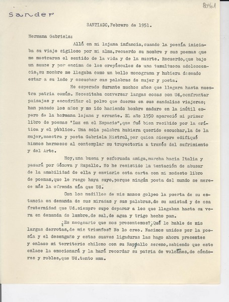 [Carta] 1951 feb., Santiago, [Chile] [a] Gabriela [Mistral] [manuscrito] Carlos Sander.