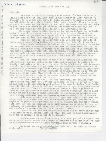 [Carta] 1952 mar. 10, Madrid, [España] [a] Gabriela [Mistral] [manuscrito] Carlos Sander.