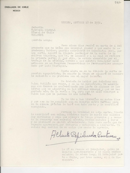 [Carta] 1950 oct. 18, México [a] Gabriela Mistral, Veracruz, [México] [manuscrito] Alberto Sepúlveda Contreras.