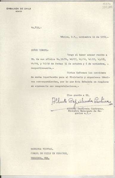 [Oficio] N° 833, 1950 nov. 11, México D. F. [a] Gabriela Mistral, Cónsul de Chile, Veracruz [manuscrito] Alberto Sepúlveda Contreras.