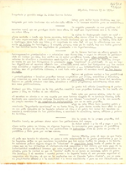 [Carta] 1952 feb. 13, Nápoles, [Italia] [al] Respetado y querido amigo D. Jaime Torres Bodet [manuscrito] Gabriela Mistral.