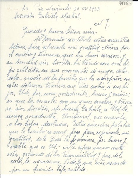 [Carta] 1953 nov. 30, La paz [a] Gabriela Mistral [manuscrito] Sara de Nuñez del Prado.
