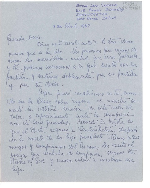 [Carta] 1957 abr. 3, Visva Bharati University, Santikiketan, West Bengal, India [a] Doris Dana, [New York, Estados Unidos] [manuscrito] Mireya.