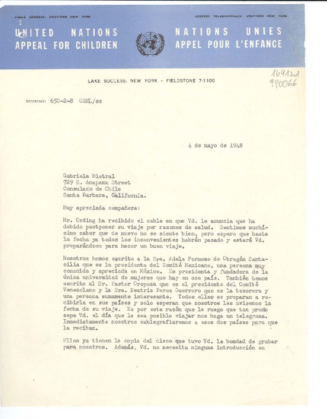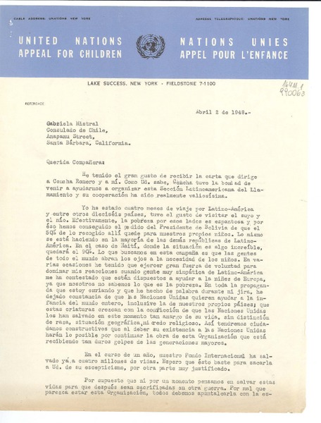 [Carta] 1948 mayo 4, United Nations Appeal for Children, Lake Succes, New York, [EE.UU.] [a] Gabriela Mistral, 729 E. Anapamu Street, Consulado de Chile, Santa Barbara, California, [EE.UU.] [manuscrito] Carmen S. Bustamante de Lozada, U.N.A.C., Sección Latinoamericana.