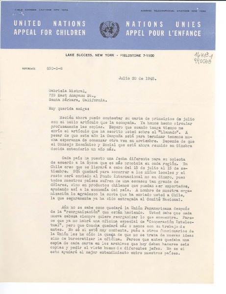 [Carta] 1948 julio 30, United Nations Appeal for Children, Lake Succes, New York, [EE.UU.] [a] Gabriela Mistral, 729 East Anapamu St., Santa Bárbara, California, [EE.UU.] [manuscrito] Carmen S. Bustamante de Lozada, U.N.A.C., Sección Latinoamericana.
