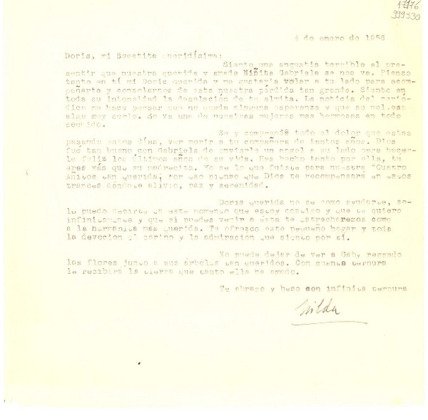 [Carta] 1956 ene. 6 [a] Doris Dana [manuscrito] Nilda [Núñez del Prado].