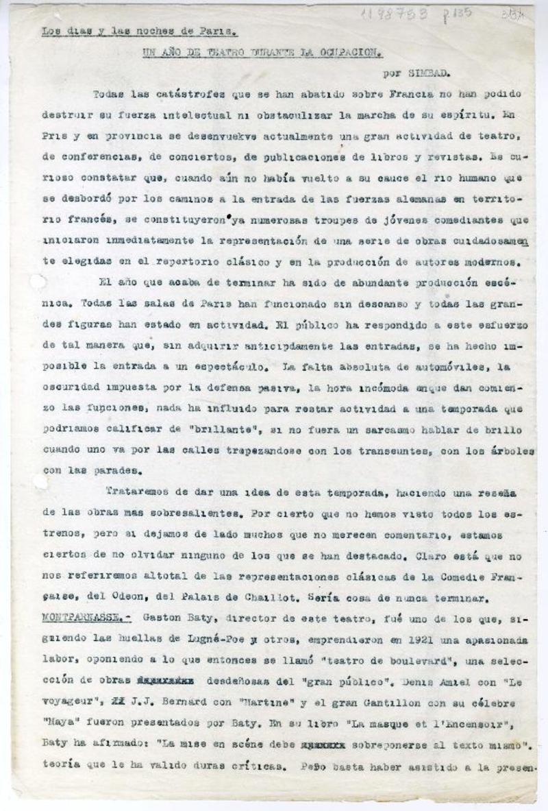 Un año de Teatro durante la ocupación [manuscrito] Salvador Reyes.