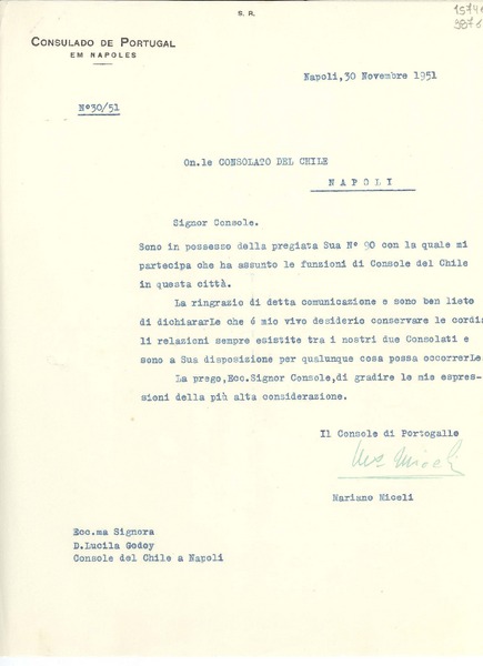 [Carta] 1951 nov. 30, Napoli, [Italia] [a] Eccma. Signora D. Lucila Godoy, Console del Chile a Napoli [manuscrito] Il Console di Portogallo, Mariano Miceli.