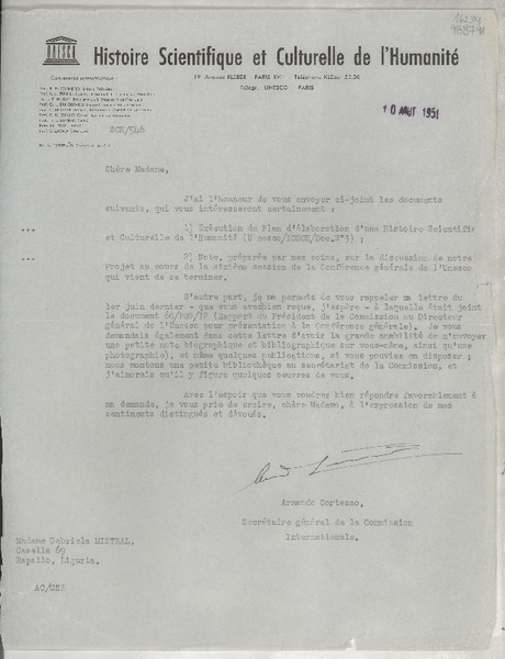 [Carta] 1951 août 10, 19, Avenue Kleber, Paris XVI°, [France] [a] Madame Gabriela Mistral, Casella 69, Rapallo, Liguria, [Italia] [manuscrito] Armando Cortesão, Secrétaire général de la Commission Internationale.