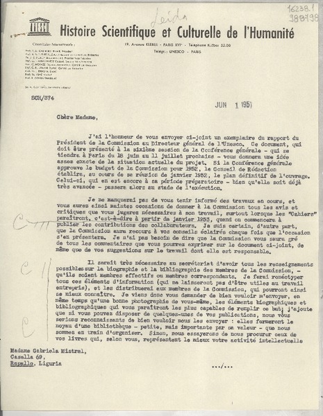[Carta] 1951 jun. 1, Paris, [Francia] [a] Madame Gabriela Mistral, Casella 69, Rapallo, Liguria [manuscrito] Armando Cortesao.