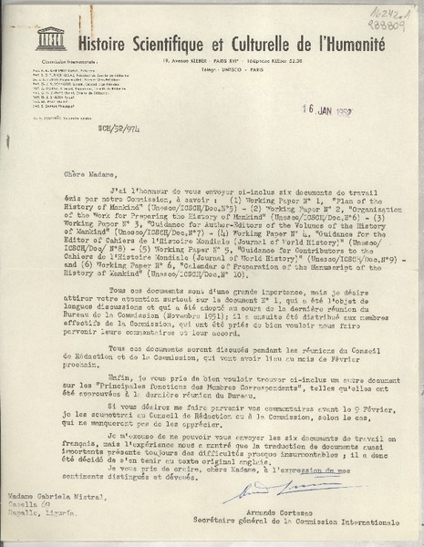 [Carta] 1952 janv. 16, 19, Avenue Kleber, Paris XVI°, [France] [a] Madame Gabriela Mistral, Casella 69, Rapallo, Liguria, [Italia] [manuscrito] Armando Cortesão, Secrétaire général de la Commission Internationale.