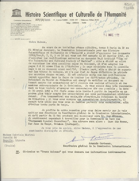 [Carta] 1952 mars 14, 19, Avenue Kleber, Paris XVI°, [France] [a] Madame Gabriela Mistral, Casella 69, Rapallo, Liguria, [Italia] [manuscrito] Armando Cortesão, Secrétaire général de la Commission Internationale.