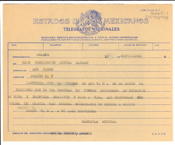 [Telegrama] 1949 sep. 12, [Jalapa, México] [a] presidente Miguel Alemán, México D.F., [México] [manuscrito] Gabriela Mistral.