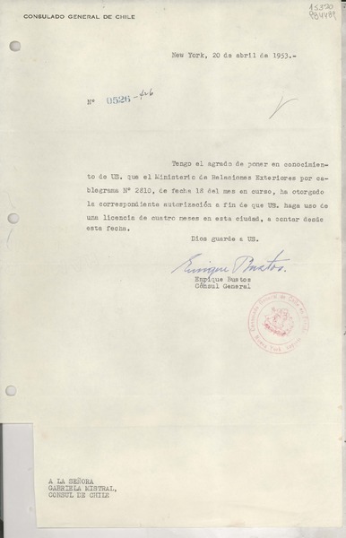 [Oficio] N° 0526-426, 1953 abr. 20, New York, Estados Unidos [a la] Señora Gabriela Mistral, Cónsul de Chile [manuscrito] Enrique Bustos, Cónsul General.