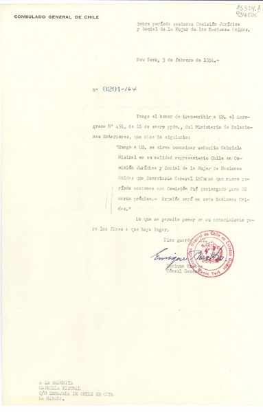 [Oficio] N° 0201-164, 1954 feb. 3, New York, [EE.UU.] [a la] Señorita Gabriela Mistral [manuscrito] Enrique Bustos, Cónsul General.