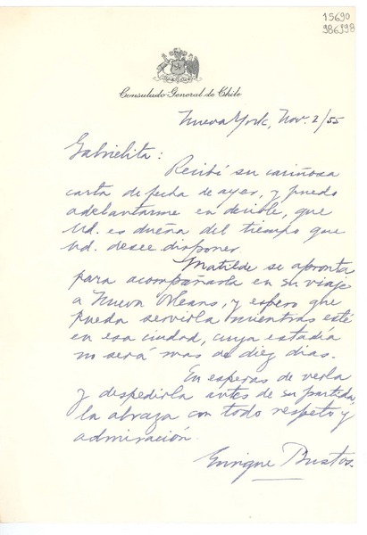 [Carta] 1955 oct. 26, New York, [Estados Unidos] [a] Sr. Enrique Bustos, Cónsul General, Chilean Consulate, 61 Broadway, New York City [manuscrito] Gabriela Mistral.