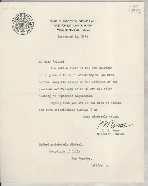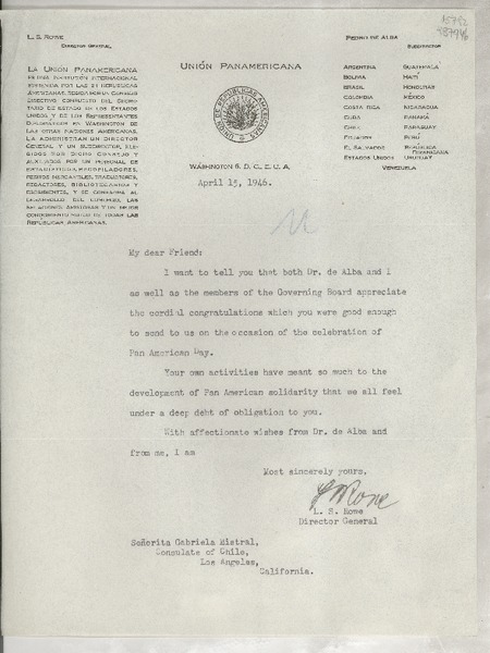 [Carta] 1946 Apr. 15, Washington, D. C., E.U.A. [a la] Señorita Gabriela Mistral, Consulate of Chile, Los Angeles, California, [EE.UU.] [manuscrito] L. S. Rowe, Director General.