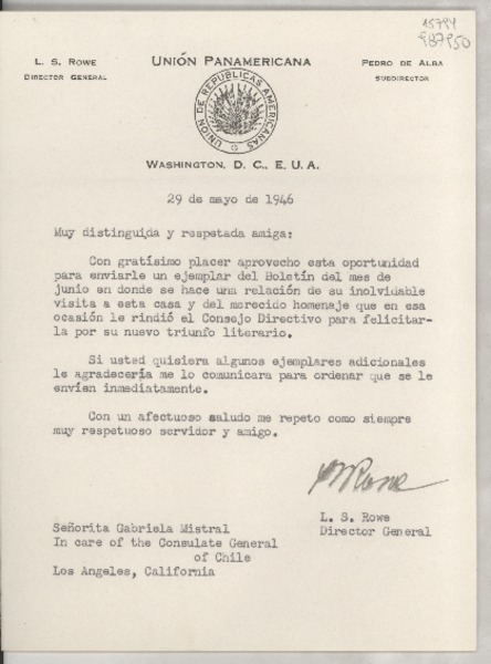 [Carta] 1946 mayo 29, Washington, D. C., E.U.A. [a la] Señorita Gabriela Mistral, In care of the Consulate General of Chile, Los Angeles, California, [EE.UU.] [manuscrito] L. S. Rowe, Director General.