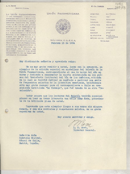 [Carta] 1934 feb. 15, Washington, D. C., E.U.A. [a] Señorita doña Gabriela Mistral, Cónsul de Chile, Madrid, España [manuscrito] L. S. Rowe, Director General.