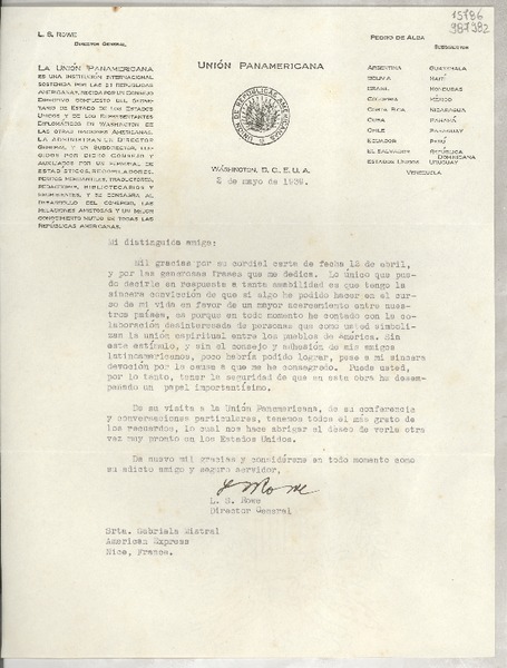 [Carta] 1939 mayo 2, Washington, D. C., E.U.A. [a] Srta. Gabriela Mistral, American Express, Nice, France [manuscrito] L. S. Rowe, Director General.