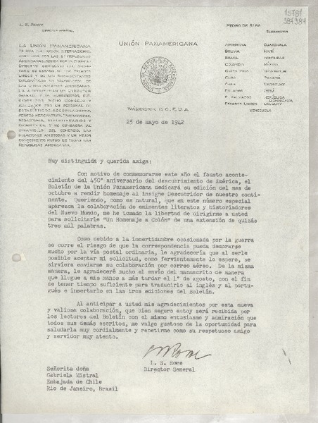 [Carta] 1942 mayo 25, Washington, D. C., E.U.A. [a] Señorita doña Gabriela Mistral, Embajada de Chile, Río de Janeiro, Brasil [manuscrito] L. S. Rowe, Director General.