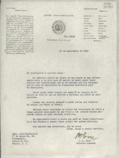 [Carta] 1942 sept. 17, Washington, D. C., E.U.A. [a] Srta. Gabriela Mistral, Petrópolis, Estado do Rio, Brasil [manuscrito] L. S. Rowe, Director General.