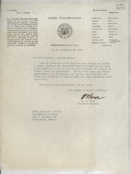 [Carta] 1945 nov. 16, Washington, D. C., E.U.A. [a] Srta. Gabriela Mistral, Petrópolis, Brasil [manuscrito] L. S. Rowe, Director General.