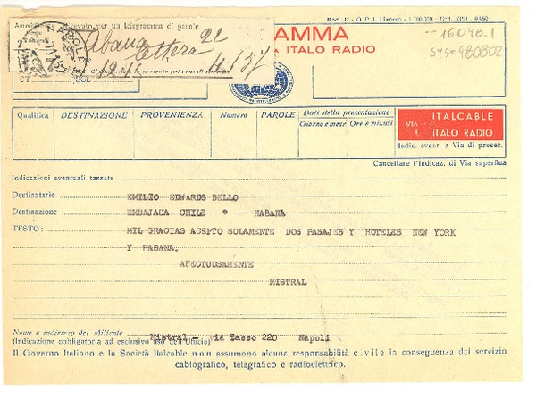 [Carta] [a] Emilio Edwards Bello, La Habana [manuscrito] Gabriela Mistral.