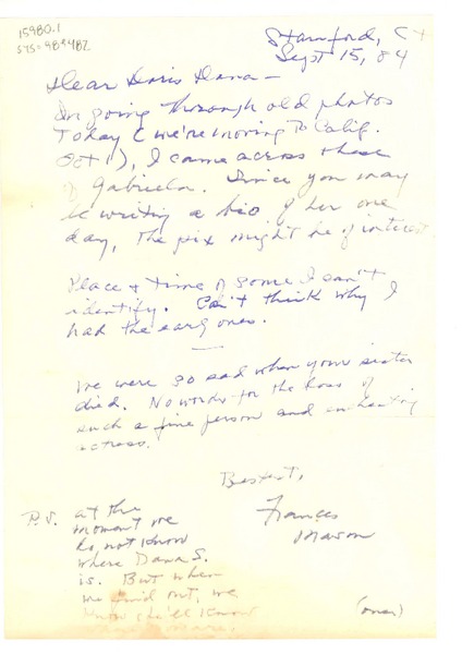 [Carta] 1984 sept. 15, Stanford, [Estados Unidos] [a] Doris Dana [manuscrito] Frances Mason.