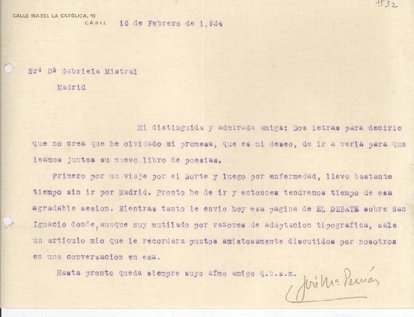 [Carta] 1934 feb. 16, [Cádiz, España] [a] Gabriela Mistral, Madrid, [España] [manuscrito] José María Pemán.
