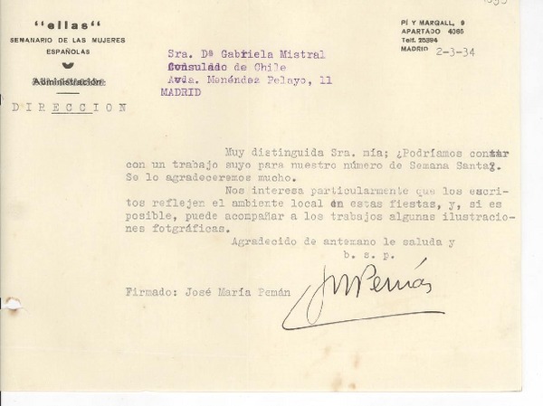 [Carta] 1934 mar. 2, [Madrid, España] [a] Gabriela Mistral, Madrid, [España] [manuscrito] José María Pemán.