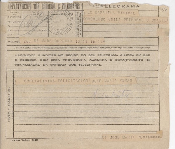 Mistral, Gabriela - Pemán, José María - Manuscritos españoles - Autores españoles - Correspondencia