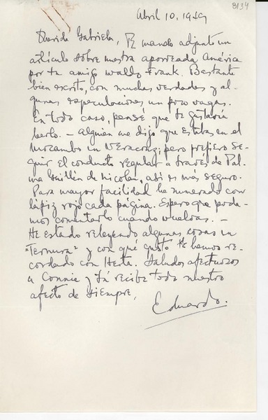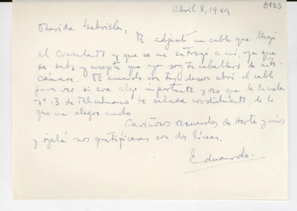 [Carta] 1949 abr. 8, [Estados Unidos] [a] Gabriela Mistral [manuscrito] Eduardo [Schijman].