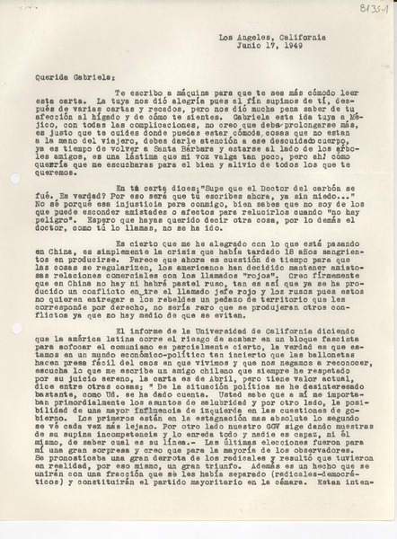 [Carta] 1949 jun. 17, Los Angeles, California, [EE.UU.] [a] Gabriela [Mistral]