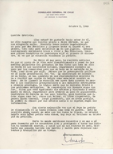 [Carta] 1949 oct. 3, [Los Angeles, California, EE.UU.] [a] Gabriela [Mistral]