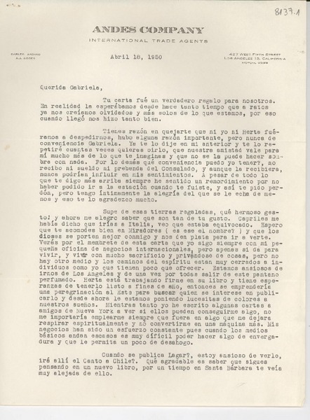 [Carta] 1950 abr. 18, Los Angeles, California, [EE.UU.] [a] Gabriela [Mistral]