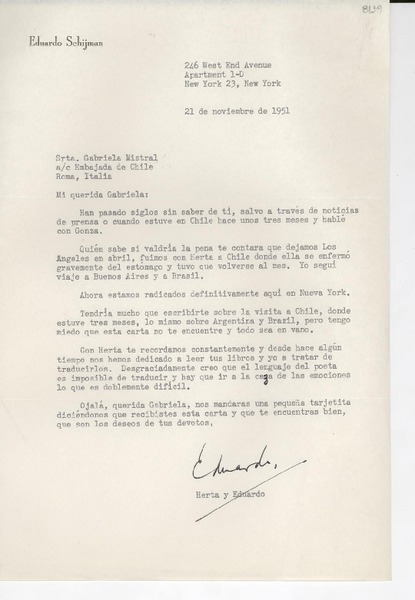 [Carta] 1951 nov. 21, New York, [EE.UU.] [a] Gabriela Mistral, Roma, Italia [manuscrito] Eduardo [Schijman].
