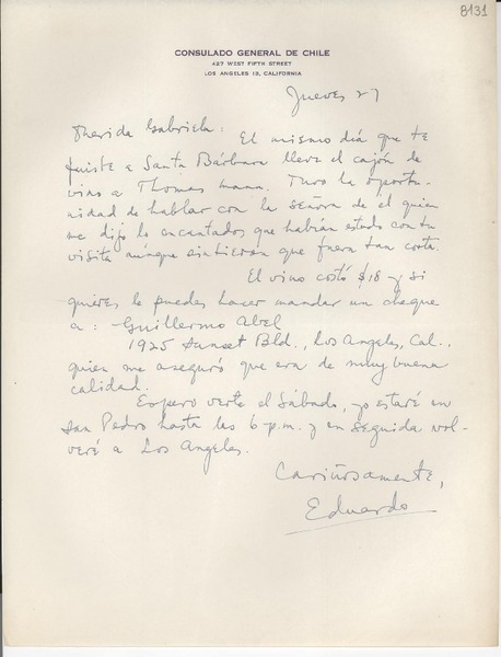 [Carta] 1948, Los Angeles, California [a] Gabriela Mistral [manuscrito] Eduardo [Schijman].