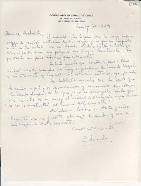 [Carta] 1949 mar. 30, Los Angeles, California [a] Gabriela Mistral [manuscrito] Eduardo [Schijman].