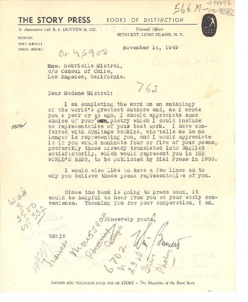[Carta] 1949, nov. 14, Long Island, N.Y., [Estados Unidos] [a] Gabriella Mistral, Los Angeles, California, [Estados Unidos] [manuscrito] Whit Burnett.