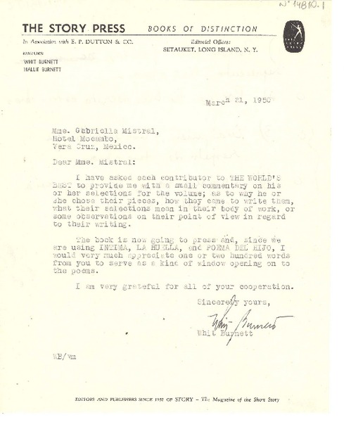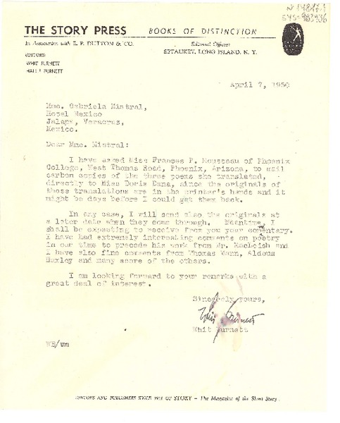 [Carta] 1950 apr. 7, Long Island, New York, [Estados Unidos] [a] Gabriela Mistral, Hotel México, Jalapa, Veracruz, México [manuscrito] Whit Burnett.