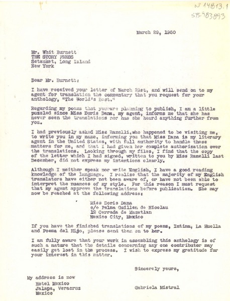 [Carta] 1950 mar. 29, Hotel México, Jalapa, Veracruz, México [a] Whit Burnett, Long Island, New York, [Estados Unidos] [manuscrito] Gabriela Mistral.
