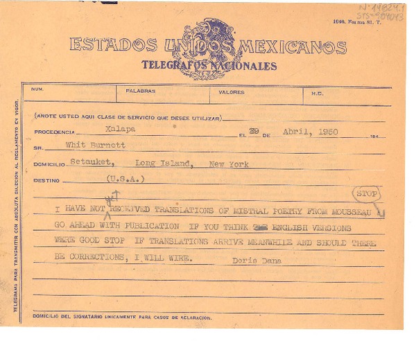 [Telegrama] 1950 apr. 25, Xalapa, [México] [a] Whit Burnett, Long Island, New York, [Estados Unidos] [manuscrito] Doris Dana.