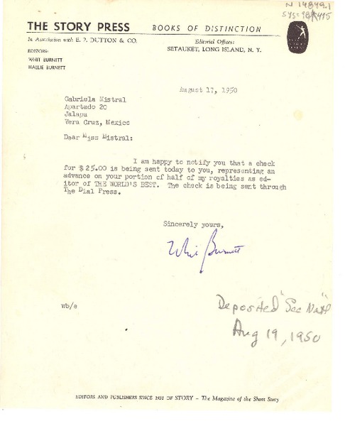 [Carta] 1950 aug. 17 Long Island, New York, [Estados Unidos] [a] Gabriela Mistral, Veracruz, México [manuscrito] Whit Burnett.
