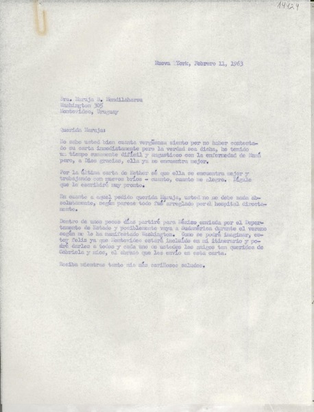 [Carta] 1963 feb. 11, Nueva York, [EE.UU.] [a la] Sra. Maruja B. Mendilaharsu, Washington 305, Montevideo, Uruguay [manuscrito] [Doris Dana].