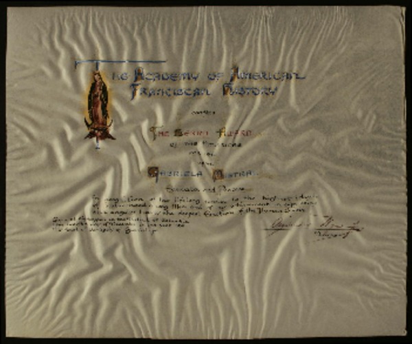 [Diploma] 1950 dic. 12, Washington, Estados Unidos [a] Gabriela Mistral [manuscrito] Academy of American Franciscan History.