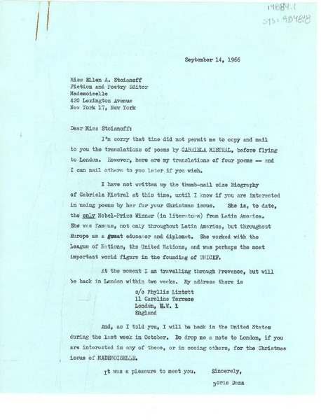 [Carta] 1966 oct. 19, New York, [Estados Unidos] [a] Doris Dana, London, England [manuscrito] Ellen A. Stoianoff.