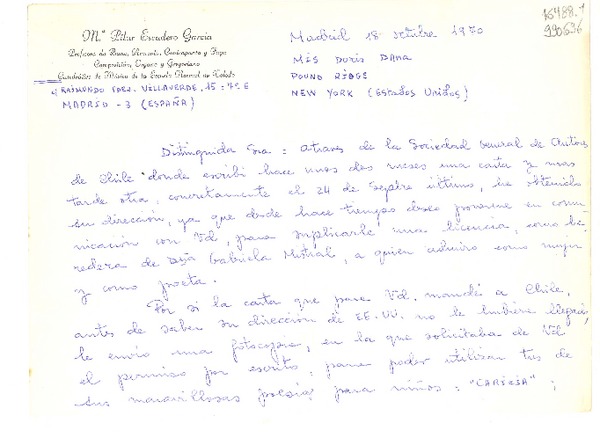[Carta] 1970 oct. 18, Madrid, España [a] Miss Doris Dana, Pound Ridge, New York, Estados Unidos [manuscrito] M. Pilar Escudero.